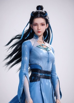 score_9,high detail,best quality,cinematic lighting,volumetric lighting,shiny skin,shiny,wanjiangyu,1girl,solo,black eyes,black hair,long hair,dress,earrings,blue dress,white background,realistic,jewelry,hair ornament,necklace,simple background,closed mouth,long sleeves,hair bun,sash,hair ribbon,looking at viewer,thighs,<lora:Pony_DetailV2.0:0.8>,<lora:皮肤凹痕:0.1>,<lora:QQSponywanjiangyuV1:0.8>,