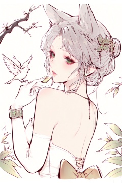 strong impression,,lineart,Masterpiece, best quality, newest, year 2024, year 2023, very aesthetic, extreme aesthetic, visual impact,1girl, animal ears, bird, fruit, gloves, looking at viewer, food, elbow gloves, white gloves, solo, parted lips, breasts, looking back, beads, fox ears, dress, hair ornament, jewelry, branch, bare shoulders, from behind, gauntlets, grey hair, holding, bangs, bracelet, backless outfit, back bow, back, bare back, blush, large breasts, single hair bun, white dress, copyright name, green eyes, leaf, hair bun, gem, eyelashes, backless dress, animal ear fluff, fox girl, parted bangs, braid, plant, peach