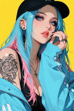 1girl, solo, long hair, looking at viewer, blue eyes, long sleeves, hat, jewelry, blue hair, jacket, upper body, pink hair, multicolored hair, earrings, parted lips, hand up, necklace, off shoulder, nail polish, two-tone hair, lips, fingernails, sleeves past wrists, eyelashes, black headwear, tattoo, makeup, piercing, ring, blue jacket, ear piercing, black nails, baseball cap, yellow background, eyeshadow, arm tattoo, shoulder tattoo, multiple rings, masterpiece, very aesthetic, absurdres, best quality, good quality, newest, highres,Anime screencap,anime coloring,shiny,niji_style