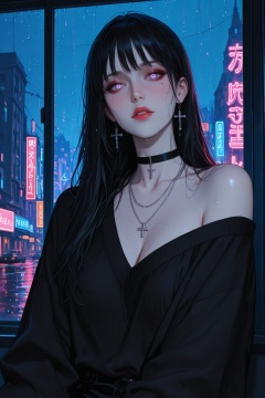 A semi-realism anime-style digital portrait of a melancholic young woman sitting by a rain-covered window at night. Her long, straight black hair is subtly streaked with violet, slightly damp as it falls over her shoulders. The ambient neon lights from the city outside reflect off the glass, casting a soft glow in shades of pink, purple, and blue across her pale skin.She gazes directly at the viewer with deep, expressive eyes, her lips slightly parted and glistening with red gloss. Her makeup is minimal but accentuates her natural beauty—light blush on her cheeks and delicate highlights beneath her eyes. She's dressed in an oversized black sweater that slips off one shoulder, revealing bare skin touched by raindrops and city light.Around her neck, she wears a black choker with metallic details and layered necklaces, including a small silver cross. The mood is introspective and cinematic, with a focus on emotional atmosphere, lighting, and delicate facial detail. The style blends soft realism with anime aesthetics, set against a rainy, neon-lit cityscape. masterpiece, best quality, newest, aesthetic, extremely aesthetic,