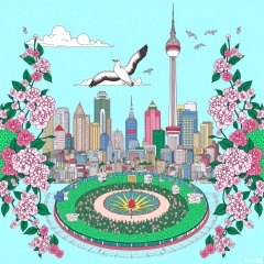 The complex details of the city of Shanghai are presented in light blue and pink tones, a scene that includes traditional buildings surrounded by blooming flowers and flying birds, with an elegant crane soaring over a circular park full of vibrant green plants. This detailed illustration depicts ancient architecture with a modern skyscraper as the backdrop, with exquisite floral patterns on both sides adding to its artistic charm, Creative illustration