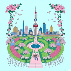 In light blue and pink tones, the complex details of the city of Shanghai are presented, a scene that includes traditional buildings surrounded by blooming flowers and flying birds, with an elegant crane soaring over a circular park full of vibrant green plants. This detailed illustration depicts ancient architecture with a modern skyscraper as the backdrop, with exquisite floral patterns on both sides adding to its artistic charm,