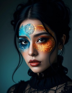 Halloween makeup,Ultra-clear facial details,A young woman,her face a canvas of Halloween artistry,imbued with a mysterious air. Bold,contrasting makeup,combining deep blues and fiery oranges,creates a striking visual effect. Intricate patterns of glowing runes are intricately etched onto her cheeks,adding a touch of magic and otherworldly beauty. Her dark hair is styled in a sophisticated updo,enhancing the overall allure and mystique of the portrait.,