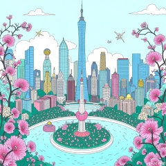 In light blue and pink tones, the complex details of the city of Shanghai are presented, a scene that includes traditional buildings surrounded by blooming flowers and flying birds, with an elegant crane soaring over a circular park full of vibrant green plants. This detailed illustration depicts ancient architecture with a modern skyscraper as the backdrop, with exquisite floral patterns on both sides adding to its artistic charm,Creative illustration