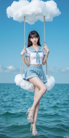 真人肌肤纹理, 4K画质,完美身材,long legs,big_breasts,navel,,Film texture,, film and television, surrealism, a girl with a delicate face is sitting on a cloud swing. The girl is wearing a jk sailor uniform, a white short-sleeved shirt, light blue stripes trimming, a light blue tie, white blue pleated skirt, exquisite diamond-encrusted high heels, swing rope The sub is connected to a cloud in the sky, the background is a vast ocean, the water shows a consistent blue-green tone, the sky is also blue-green, blending with the ocean, perfect light and shadow, hyper-realistic photography, sharpening, artistic conception, Consciousness, large areas of blank space, sense of space, haziness, dreams, fog,yueyue
