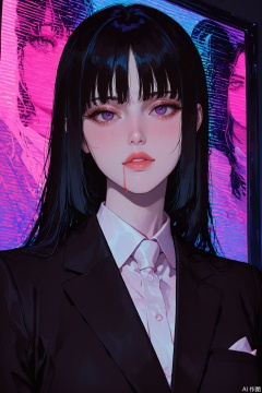 A high-resolution retro anime-style illustration featuring a beautiful girl with a classic hime-cut hairstyle, her sleek black hair framing her delicate face with precision. She wears a black formal suit tailored to her slender figure, exuding elegance and mystery. Her deep, sensual eyes hold an intense gaze, accentuated by thick, bold outlines and subtle airbrush highlights that add depth to her expression. The background is dark, illuminated by neon lights in electric blues, purples, and pinks, which reflect softly on her pale skin, creating a mesmerizing contrast. The colors are vibrant yet slightly muted, evoking the nostalgic aesthetic of 80s and 90s anime. Flat cel shading defines the shapes, while halftone patterns and slight color bleeding give the illustration a vintage printed feel. Hand-drawn imperfections, a subtle VHS glow, and a fine film grain overlay add authenticity, making the piece feel like a lost frame from an old anime film. The atmosphere is moody and intimate, blending retro futurism with classic anime beauty., masterpiece, best quality, newest, aesthetic, extremely aesthetic,