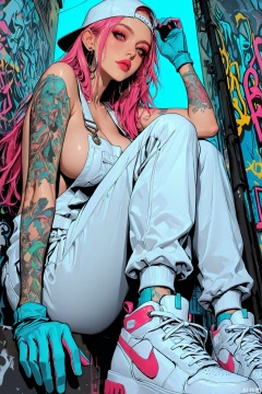 high_quality, highres, detailed_eyes, detailed, masterpiece, best quality, absurdres, 8k, HDR, face_focus, flat illustration, flat colors, high contrast, (artist:billyhhyb), cyber_fashion, cyber_tech, pop_art_(style),grunge, deep-shading, ray-tracing, backlight, hip_hop, 1girl, pink hair, blunt, long hair, hoop_earrings, mascara, makeup, lip glow, solo, big breasts, white overall, sideboobs, sneakers, high heels, sweatpants, baseball cap, backwards_hat, sits on straps, work_gloves, arm_tattoo, looking at viewer, relaxing pose, knees up, leans on knee, hand forward, focus on feet, streetwear, urbanism, graffiti, detailed background, complex background, indoor, fashion, highly detailed, sketch_background, graffiti_background, gradient_background, street art, abstract, vibrant, (from side, from below, point of view),