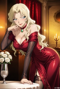 masterpiece, best quality, amazing quality, highres, 1girl, long golden curly hair with soft waves, perfect body proportions, red off - shoulder gown with black sheer lace overlay (intricate swirl patterns), red choker adorned with emerald - like gem, seductive pose: sitting at candlelit dinner table, leaning slightly forward, right hand gently swirling red wine in crystal glass, left hand resting on table near fine china, half - lidded alluring eyes, faint smirk, intimate dinner setting with candlelit table (glowing candles, polished silverware, white roses in vase), soft warm ambient light casting glows on hair and gown, background of dimly lit luxury restaurant (velvet curtains, ornate wall sconces), anime style, detailed fabric textures (lace transparency, satin gown sheen, choker gem reflection), color contrast of golden hair against red gown & warm candlelight, cinematic angle highlighting body curve and wine - glass interaction, dreamy romantic dinner atmosphere, subtle shadow play on tablecloth,Vermouth