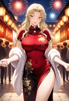 masterpiece, best quality, amazing quality, highres, 1mature female, long blonde hair with flowing glossy waves, perfect body proportions, red - black gradient cheongsam adorned with golden floral embroidery, white fluffy fur shawl draped elegantly over shoulders, thigh - high side slit revealing slender leg, seductive pose: gently leading viewer by the hand, body slightly angled, head tilted with a confident alluring smirk, night market backdrop filled with glowing red lanterns, vibrant fireworks bursting in deep blue sky, anime - style bold line art, rich color contrast (golden hair against red cheongsam & dark night), soft light reflections on fur texture and silk cheongsam, lively festival atmosphere with faint crowd silhouettes, cinematic perspective highlighting body curve and intimate hand - holding interaction, detailed fabric textures (silk sheen, embroidery intricacy, fur softness), dreamy yet vivid nighttime lighting,