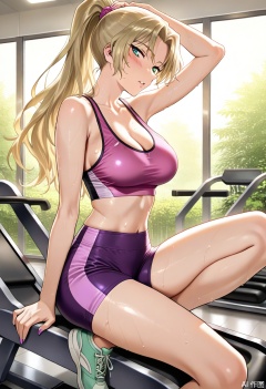 masterpiece, best quality, amazing quality, highres, 1girl, long golden hair tied in high ponytail (loose strands framing face), perfect body proportions, glossy pink deep V-neck backless sports crop top (revealing midriff & shoulder blades), high-waisted gradient purple compression shorts (thigh-grazing length), pink anti-slip sport wristbands, mint green sneakers, seductive pose: sitting on treadmill edge, legs slightly parted, back arched, left hand slowly trailing along inner thigh, right hand gripping treadmill rail, head tilted toward viewer with half-lidded alluring eyes, gym background (multiple treadmills, patterned wallpaper, large windows showing lush greenery, warm ambient light), glistening sweat droplets on skin (chest/shoulders/legs), anime-style bold cell-shading, fabric sheen on athletic wear (satin-like sports crop top, compression shorts texture), vibrant color harmony (golden hair vs pink/purple attire), cinematic low-angle shot emphasizing body curve & seductive posture, detailed sweat reflections catching light, dynamic tension in pose, modern gym atmosphere with soft depth of field,Vermouth