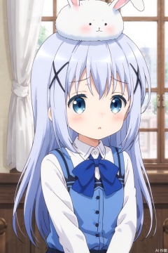 1girl,solo,long hair,blush,bangs,blue eyes,shirt,hair ornament,bow,blue hair,white shirt,upper body,parted lips,hairclip,collared shirt,indoors,bowtie,:o,vest,window,blue bow,x hair ornament,wing collar,curtains,on head,light blue hair,blue vest,animal on head,rabbit house uniform,rabbit on head,tippy \(gochiusa\),embarrassed , blush, shy, nose blush ,
