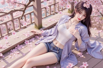 1girl,branch,breasts,brown eyes,brown hair,cherry blossoms,denim,earrings,falling leaves,falling petals,hanami,hand on own chest,jewelry,large breasts,leaves in wind,looking at viewer,navel,open clothes,open shirt,petals,petals on liquid,porch,ring,rose petals,shirt,short shorts,shorts,solo,spread legs,spring \(season\),tree,