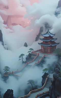 GFXJ, A photograph of a mystical Chinese cloud - covered peak at dawn, featuring a majestic, intricately carved stone temple with gray and gold details. The temple sits atop the peak, surrounded by swirling clouds and mist, with a stone staircase winding up to it. The sky is a mix of soft pink and light blue, with a faint outline of other peaks in the distance. The scene is filled with a sense of awe - inspiring grandeur and spiritual tranquility.