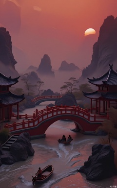 GFXJ, A photograph of a charming Chinese water village at twilight, showcasing a picturesque, wooden bridge with red and black accents. The bridge crosses over a winding canal, with traditional boats floating by and ancient houses lining the banks. The sky is a gradient of deep orange and purple, with a faint reflection of the setting sun in the water. The atmosphere is one of peaceful coexistence with nature and time - honored traditions.