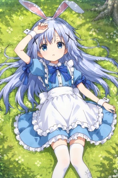 1girl, solo, long hair, blue eyes, thighhighs, dress, bow, animal ears, blue hair, lying, frills, striped, on back, rabbit ears, apron, white thighhighs, wrist cuffs, fake animal ears, blue dress, grass, x hair ornament, white apron, alice \(alice in wonderland\) \(cosplay\), kafuu chino, alice \(alice in wonderland\)