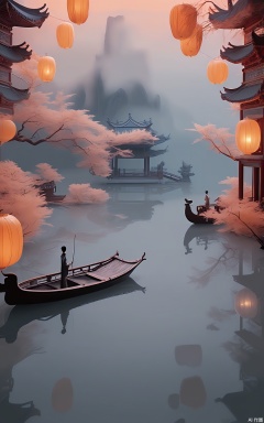 GFXJ, A photograph of a serene Chinese willow - shaded lake at dusk, featuring an elegant, ornate boat with blue and gold decorations. The boat floats on the calm lake, with willow branches hanging over it and paper lanterns lighting up the area. The sky is a gradient of soft orange and soft gray, with a faint reflection of the surrounding scenery in the water. The scene is a picture of peaceful serenity and natural splendor.