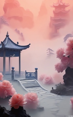 GFXJ, A photograph of a secluded Chinese fairyland garden at dawn, showcasing a magnificent, elaborately carved pavilion with blue and silver accents. The pavilion is enveloped in soft morning mist and surrounded by blooming peonies, with a winding stone path leading towards it. The sky is a blend of lavender and soft gold tones, with a distant silhouette of a willow tree swaying gently. The scene exudes a peaceful and otherworldly charm, filled with an air of timeless elegance and serenity.