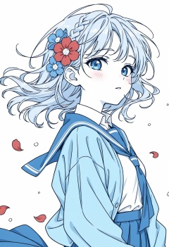 1girl, aqua jacket, blue eyes, blue flower, blue sailor collar, blue theme, blush, braid, cloud, collared shirt, falling petals, floating hair, flower, from side, hair flower, hair ornament, long skirt, looking ahead, looking at viewer, monochrome, portrait, red flower, shirt, shirt tucked in, simple background, sketch, solo, upper body, water drop, white background, white shirt