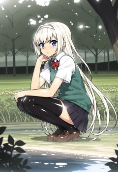 1girl,white haired girl \(munashi mujou\),full body,outdoors,shoes,hairband,zettai ryouiki,solo,white shirt,skirt,shirt,brown footwear,tree,parted lips,very long hair,school uniform,blue eyes,long hair,loafers,day,red bow,red bowtie,bow,water,squatting,looking at viewer,short sleeves,bowtie,blonde hair,white hairband,thighhighs,sweater vest,black thighhighs,grass,miniskirt,black skirt,pleated skirt,Beautiful natural scenery. A young girl with long white hair and blue eyes is squatting on the grass in a park near a lake. She has black thigh-high stockings on her legs and brown shoes on her feet. The background of the image features a green lawn with trees and bushes around the lake,Beautiful natural scenery. she has a serious expression on her face and is looking off to the side. in the foreground,there is a young girl with long blonde hair and blue eyes sitting on the grass near a body of water. the overall mood of the image is peaceful and serene.,