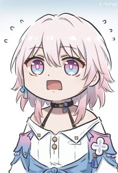 xinzoruo,lyy,honkai \(series\),honkai: star rail,march 7th \(honkai: star rail\),march 7th \(preservation\) \(honkai: star rail\),1girl,bare shoulders,black choker,blue eyes,bra strap,chibi,choker,long sleeves,multicolored eyes,off-shoulder shirt,off shoulder,open mouth,pink hair,purple eyes,shirt,short hair,solo,two-tone eyes,upper body,white shirt,
