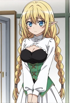 yano akane,choujin koukousei-tachi wa isekai demo yoyuu de ikinuku you desu!,lilulu \(choyoyu\),1girl,anime coloring,bare shoulders,blonde hair,blue eyes,braid,breasts,cleavage,closed mouth,cowboy shot,dress,elf,hair between eyes,hair ribbon,indoors,large breasts,long hair,long sleeves,low twin braids,pointy ears,ribbon,shirt,sidelocks,solo,standing,twin braids,very long hair,