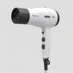 DSCP, Photograph of a professional-grade hairdryer, a sleek white body with a black nozzle, featuring multiple heat and speed settings. The handle is ergonomic and comfortable to hold. The background is a light gray, allowing the hairdryer to take center stage. The design is modern and efficient. The lighting is focused, showing the product's quality.