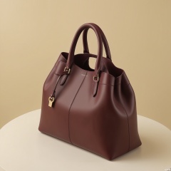 DSCP, Photograph of a designer handbag, a medium-sized tote in a rich burgundy leather, with gold hardware and a detachable shoulder strap. The interior is lined with a soft fabric and has multiple compartments. The background is a pale yellow, making the handbag the focal point. The design is chic and timeless. The lighting is soft, highlighting the leather's texture.