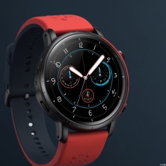 DSCP, Photograph of a stylish smartwatch, a round face with a black bezel and a silicone strap in a vibrant red. The display shows the time and various health metrics. The background is a deep navy blue, enhancing the watch's visibility. The design is sporty yet elegant. The lighting is bright, emphasizing the watch's details.
