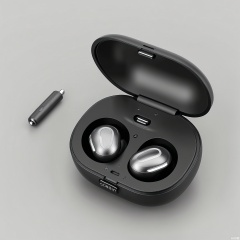DSCP, Photograph of a high-end wireless earbuds, a sleek black charging case with a matte finish, labeled "SONIQ" in silver letters. The earbuds inside are glossy black, and the case has a small LED indicator light. The background is a solid gray, drawing attention to the product. The design is minimalist with clean lines. The lighting is even, showcasing the earbuds' sleekness.