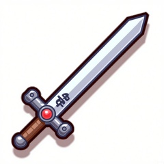 MBDJ, A digital drawing of a shiny silver sword with a jeweled hilt, placed on a plain white surface. The blade has a slight curve and is etched with mystical symbols. The hilt features a large, red gemstone at the pommel. The style is cartoonish and detailed, with clean outlines and a touch of metallic sheen. A shadow casts from the sword, indicating a light from above.
