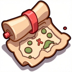 MBDJ, A digital drawing of a treasure map rolled up and tied with a red ribbon, lying on a plain white sheet. The map has faded edges and is marked with an "X" in a mysterious location. There are also small illustrations of islands and sea monsters. The style is cartoonish and nostalgic, with rough lines and a sepia-toned effect. A shadow under the map gives it a three-dimensional feel.