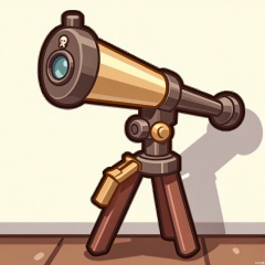 MBDJ, A digital drawing of a pirate's telescope with a brass body and a leather grip, leaning against a plain white wall. The telescope has a small, magnifying lens at one end and is decorated with a skull and crossbones emblem. The style is cartoony and adventurous, with detailed textures and a warm color palette. A shadow casts from the telescope, indicating the light's direction.