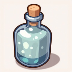 MBDJ, A digital drawing of a potion bottle with a cork stopper and a label reading "Invisibility", sitting on a plain white shelf. The liquid inside is a swirling, silver color. The bottle has small bubbles rising to the surface. The style is cartoony and mysterious, with clean lines and a subtle glow effect. A shadow under the bottle suggests a light from above.