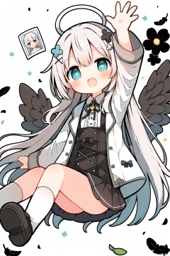 (((artist:nano))),loli,1girl, solo, long hair, breasts, looking at viewer, blush, smile, open mouth, bangs, blue eyes, skirt, shirt, hair ornament, long sleeves, white background, dress, bow, ribbon, hair between eyes, very long hair, jacket, full body, white shirt, grey hair, flower, white hair, :d, multicolored hair, pleated skirt, frills, open clothes, wings, shoes, sleeveless, socks, collared shirt, wide sleeves, black skirt, black footwear, black dress, arm up, open jacket, sleeves past wrists, kneehighs, black bow, gradient hair, neck ribbon, white jacket, feathers, x hair ornament, white socks, knees up, black wings, photo \(object\), shoe soles