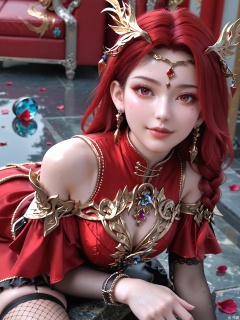 score_9,score_8_up,score_7_up,1girl,looking_at_viewer,realistic,1girl,Vivid Colors,bright environment,delicate water,hair_ornament,shiny skin,shiny hair,reflection,dress,flower sea,falling petals,extreme detail description,(full body:0.3),put one hand on your side,long_hair,(skindentation:1.3),Fishnet stockings,bright,sunshine on face,hair,light,sweating,red dress,forehead_mark,light,sitting_down,single_braid,facial_mark