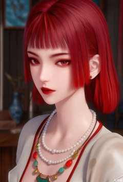 1girl, solo,short hair,looking at viewer,red hair,short hair,indoors,blurry,jewelry,earrings,blunt bangs,makeup,red lips,bead necklace, pearl necklace,