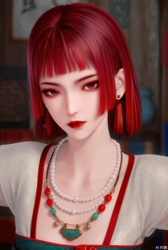 1girl, solo,short hair,looking at viewer,red hair,short hair,indoors,blurry,jewelry,earrings,blunt bangs,makeup,red lips,bead necklace, pearl necklace,