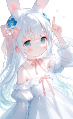 alens,loli,1girl, animal ears, solo, dress, rabbit ears, ribbon, long hair, flower, white dress, hair flower, white hair, looking at viewer, hair ornament, long sleeves, red ribbon, white background, hair between eyes, off shoulder, white flower, blue eyes, puffy sleeves, collarbone, frills, white theme, hair ribbon, arm up, frilled dress, rabbit girl, parted lips, simple background, index finger raised, pink ribbon, upper body, very long hair, off-shoulder dress, breasts, animal ear fluff, juliet sleeves, neck ribbon, blush, aqua eyes, bare shoulders, green eyes, pointing, expressionless, medium breasts, pointing up, :o, floral background, closed mouth, hand up, grey eyes, blue flower