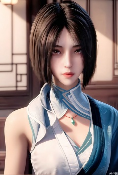 1girl, solo,short hair,looking at viewer,black hair,short hair,bob cut,brown hair,jewelry,brown eyes,indoors,blurry,clothing cutout,,chinese clothes,upper_body, realistic, masterpiece, best quality, absurdres, highres, amazing quality, very aesthetic, newest, absurdres, highres, highly detailed, very aesthetic,
