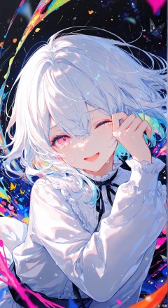 1girl, solo, looking at viewer, smile, open mouth, bangs, shirt, long sleeves, hair between eyes, white shirt, white hair, one eye closed, tears, pink eyes, crying, crying with eyes open, wiping tears