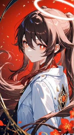 1girl, solo, long hair, looking at viewer, bangs, brown hair, shirt, red eyes, hair between eyes, closed mouth, jacket, upper body, sidelocks, from side, coat, symbol-shaped pupils, floating hair, halo, white jacket, red background, white coat, flower-shaped pupils, hu tao \(genshin impact\)