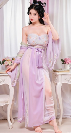 (masterpiece:1.2),Ultra clear, wallpaper, 8k, masterpiece, 1girl, solo, long hair, breasts, looking at viewer, bangs, large breasts,long dress,, bare shoulders, jewelry, black hair, standing, purple eyes, full body, flower, thighs, indoors, hair bun, long dress, high heels, cup, see-through, book, bare legs, window, table, white footwear, standing on one leg, curtains, pink flower, side slit, vase, ,(huge breasts:2.99),(full breasts:2.99),Xqianqianmeinu,Xmoxionghanfu,Xleisiqipao,Xxeushengxiaofu,XlinziyueY2,Xsongmoxionghanfu