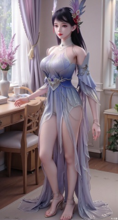 (masterpiece:1.2),Ultra clear, wallpaper, 8k, masterpiece, 1girl, solo, long hair, breasts, looking at viewer, bangs, large breasts,long dress,, bare shoulders, jewelry, black hair, standing, purple eyes, full body, flower, thighs, indoors, hair bun, long dress, high heels, cup, see-through, book, bare legs, window, table, white footwear, standing on one leg, curtains, pink flower, side slit, vase, ,(huge breasts:2.99),(full breasts:2.99),Xqianqianmeinu,Xmoxionghanfu,Xleisiqipao,Xxeushengxiaofu,XlinziyueY2,Xsongmoxionghanfu