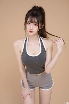 A young and beautiful woman with delicate facial features and smooth and delicate skin. She has long brown hair, some of which is tied up high, and a few strands of broken hair naturally hang down. The air bangs adorn her face. Her makeup is exquisite, with bright and lively brown eyes and rosy lips. Wearing a dark gray sports vest with white trim to add a sense of design, showcasing slender neck and shoulder lines, and a prominent career line on the chest. The shorts paired with the lower body are partially obscured by long hair, with faint light colored edges visible. She leaned slightly down, with a playful posture.