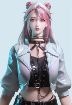(score_9),<lora:炙珠-Apony:0.86>,zizhu,1girl,solo,long hair,white hair,braid,pink braid,streaked hair,harness vest,choker,cropped jacket,chain,forehead mark,double bun,pink eyes,belt,shorts,(mature_female:1.1),mature,<lora:e色温:0.5>,(white_skin),(fair_skin),<lora:e肤色滑块:0.5>,front view,light blush,simple background,<lora:Expressive_H:0.8>,<lora:perfect-eyes:0.8>,