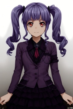 looking at viewer,Udagawa Ako,bangs,red eyes,twintails,purple hair