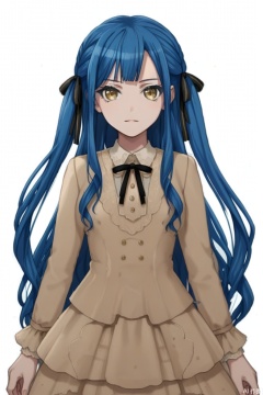 looking at viewer,sakiko,long hair, bangs, ribbon, blue hair,hair ribbon, two side up, black ribbon,yellow eyes