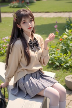 1 girl, solo, long hair, bangs, sitting on a white bench in the garden. She wore a school uniform, including a beige shirt, a black bow tie, and a plaid skirt with pleated patterns. Her legs crossed, wearing white pantyhose and black shoes. A small book and a small black bag were placed on the bench beside her. The garden is full of greenery, full of colorful flowers, and a stone road passes through it. The overall atmosphere is quiet and peaceful, with soft light suggesting it is a sunny day. Full of modern style, photo.
