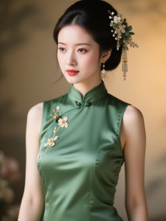 shangft,an Asian woman with fair skin and a slender physique, wearing a green silk cheongsam with floral embroidery. Her hair is styled in an elegant bun adorned with a floral hairpiece. She has a serene expression and is wearing delicate earrings. The background is softly lit with a warm, beige tone.<lora:S-T-古风写实_S1.03:1>