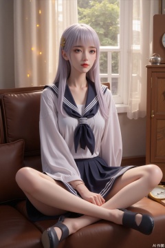 1 girl, solo, with bangs, wearing a sailor's uniform, sitting cross-legged on a brown leather sofa, her long snow-white straight hair drooped to her shoulders, and her bright eyes filled with soft light by the window. The dark blue scarf is lightly attached to the collarbone, the pleated skirt is stretched between the knees like petals, and the slender hands are lightly attached to the waist to freeze the elegant arc. The log cabinet stands quietly in the background, the time is sealed in the photo frame, the brass can refracts warm dimming spots, and the dust filtered from the gauze curtains dances in the air. The whole picture looks like a honey-soaked afternoon, with the warmth of the cortex and the sweetness of the girl intertwined into visual chords.